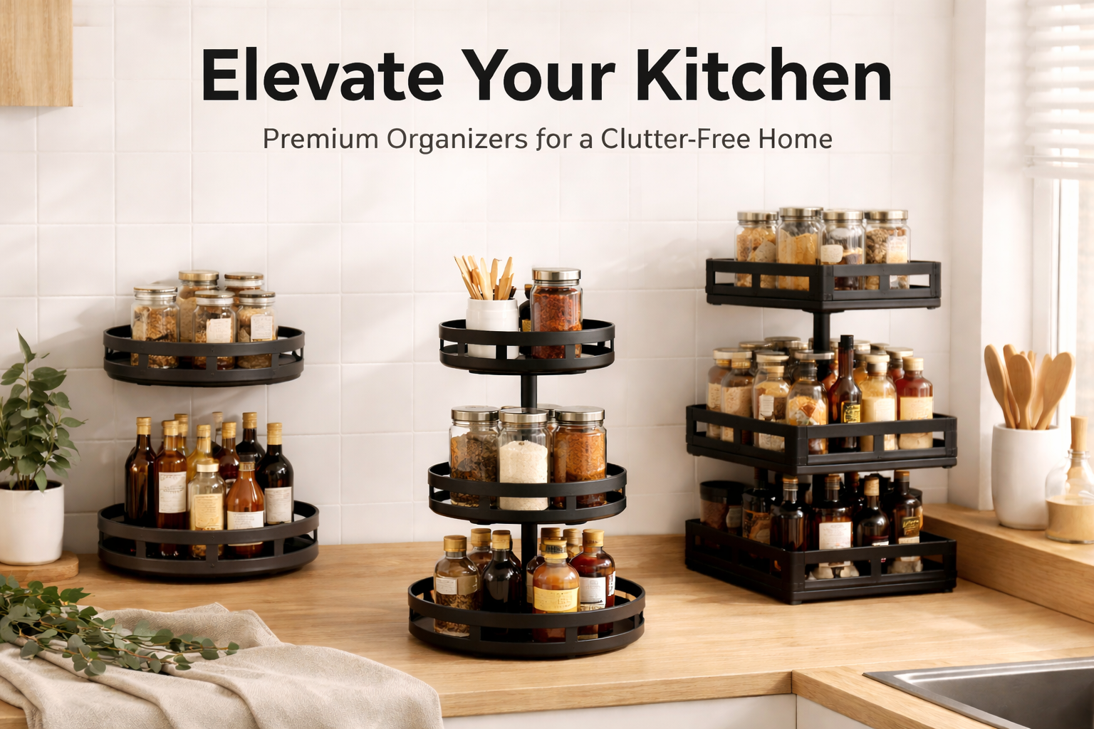 Premium Luxury Rotating Spice Rack — 3-Tier 360° Kitchen Countertop Organizer Shelf — Matte Black Steel Spice Holder Stand for Home Bar Restaurant Commercial Use — Wholesale Supplier